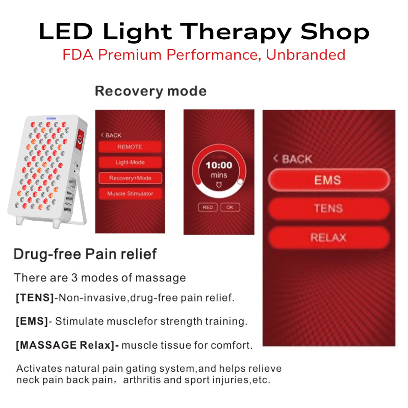 – Treatment Modes: TENS, EMS, and Massage Relax, Red, NIR, Red+NIR
