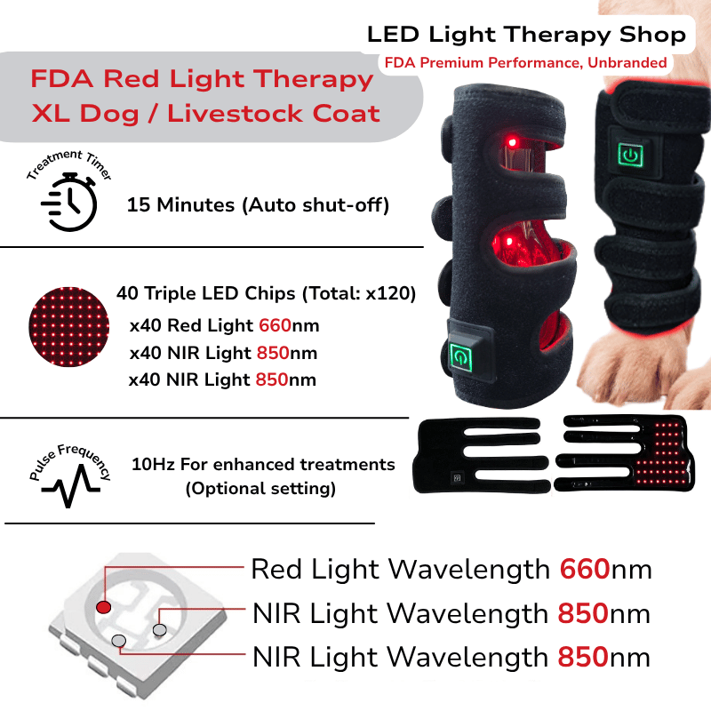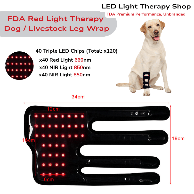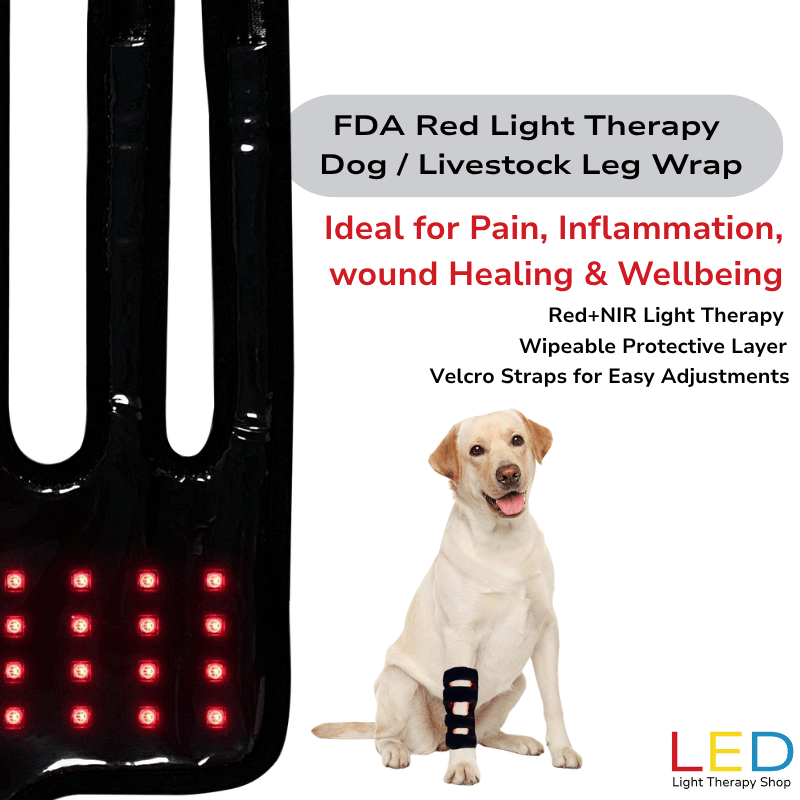 Using precise 660nm red light and 850nm near-infrared light, LED Light Therapy Shops compact FDA Red Light Therapy Leg Wrap supports natural pain relief, wound healing, improved circulation, aid muscle soreness and recovery — ideal drug-free treatment for dogs and livestock..
