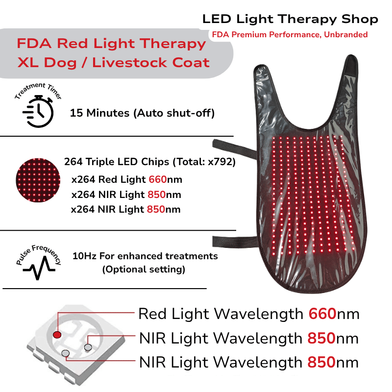 The Red Light Therapy XL Dog Coat from LED Light Therapy Shop delivers professional-grade red light therapy designed specifically for dogs and livestock.