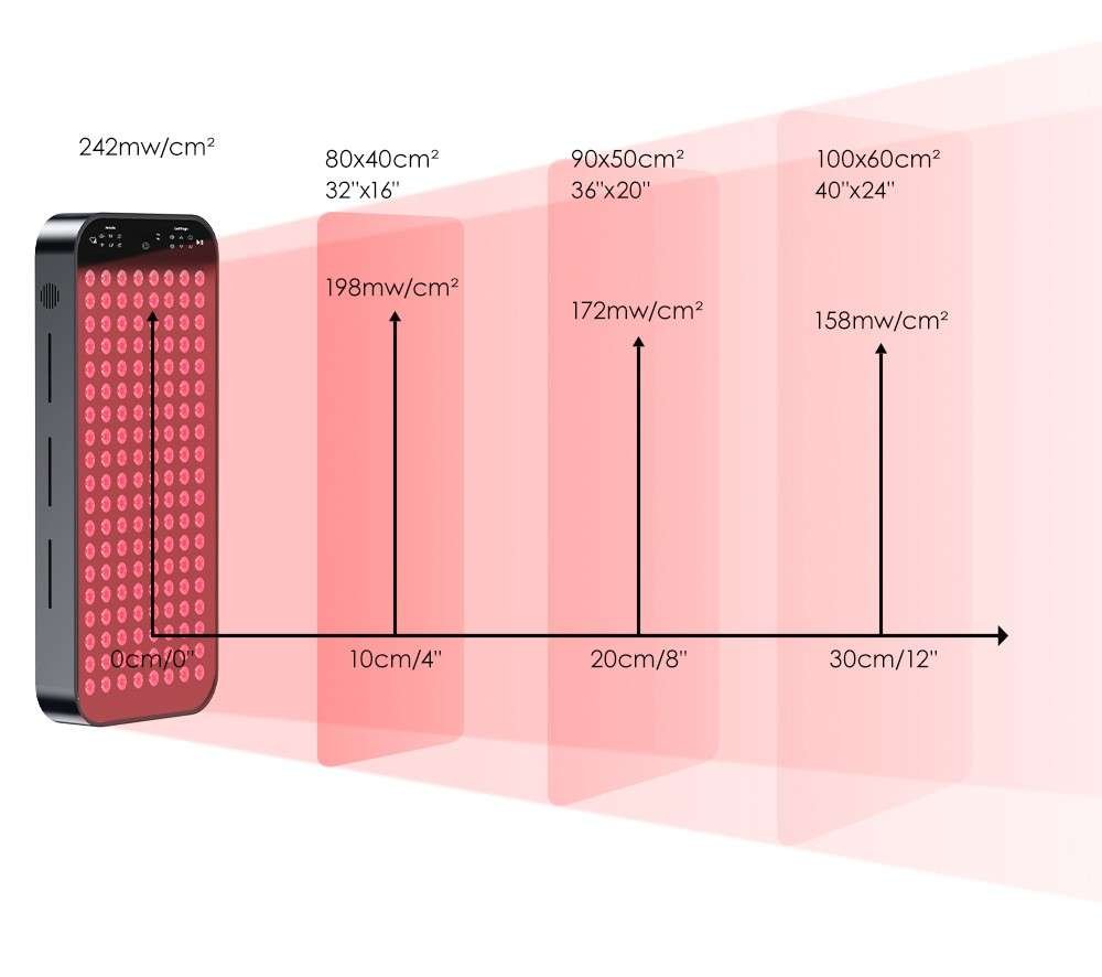 Wide (60-90 degrees): suitable for larger areas like back and chest. Medium (30-60 degrees): areas like the face or joints. Narrow (10-30 degrees): specific points or smaller areas of concern.Irradiance